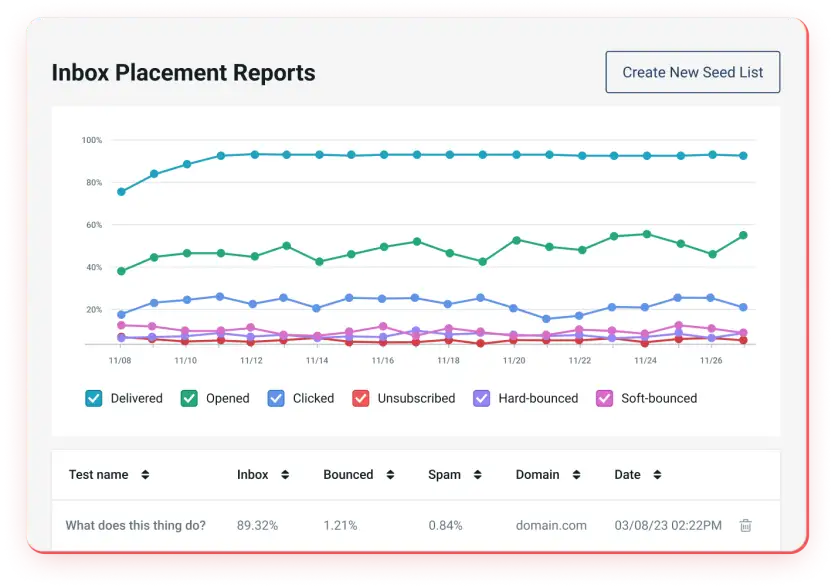 Inbox placement refers to your ability to reach recipients’ inboxes rather than being filtered into spam or rejected by receiving mail servers. Inbox placement may also be referred to as seed testing or spam testing tools.