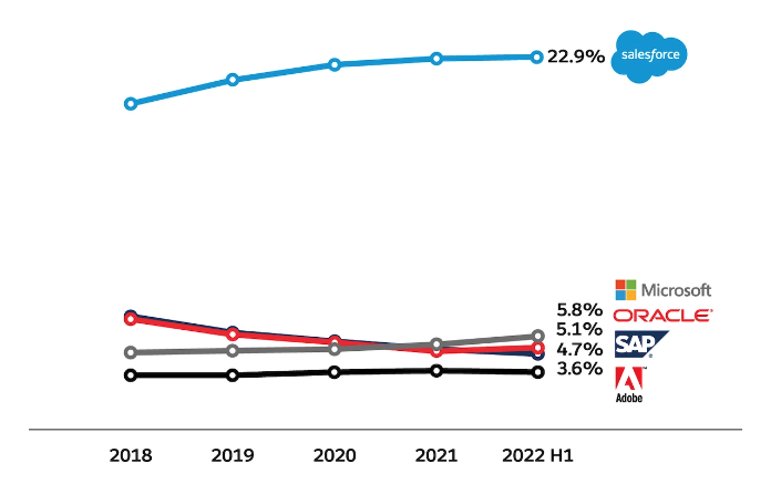 Salesforce Marketing Cloud (SFMC) has a nearly 23% market share in the CRM/automation space. That’s more than its next four closest competitors combined. So, if you’re going to learn how to code emails for a specific automation platform, you may as well start with the biggest player in the game.
