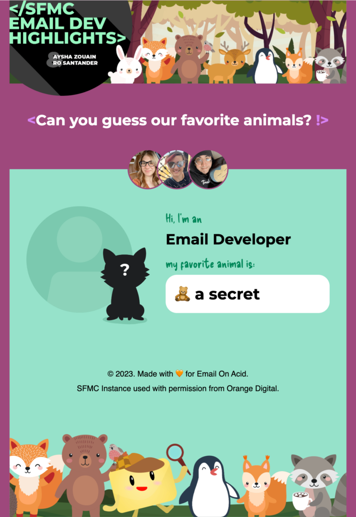 Rodrigo and Aysha created a fun email just for our show that they personalized for the three of us as well as an “unknown” subscriber. In the video, Rodrigo shows us how he used SFMC data extensions to power the personalization in this dynamic email. Depending on the recipient, the email displays a different photo, name, and animal based on what’s in the data extension. He shows us how to set up the variables and definitions for these personalizations.