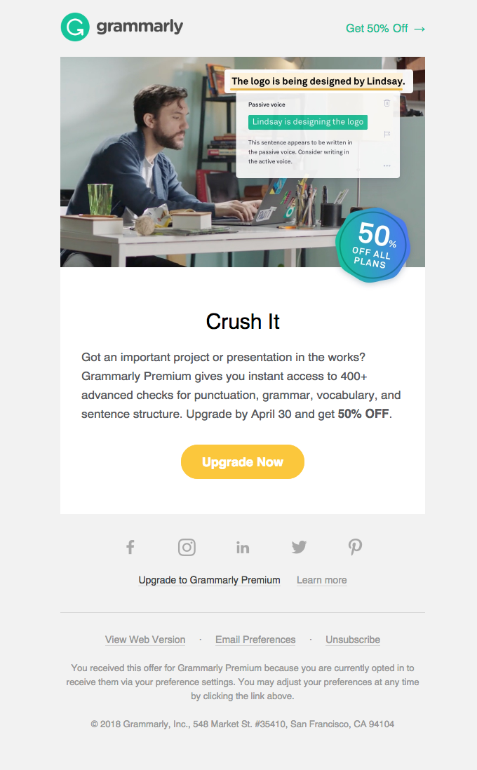 Sometimes, this can be an opportunity to both remind subscribers about your product and nudge them toward an even better option. Check out how Grammarly looks to reactivate and reengage customers with this email.